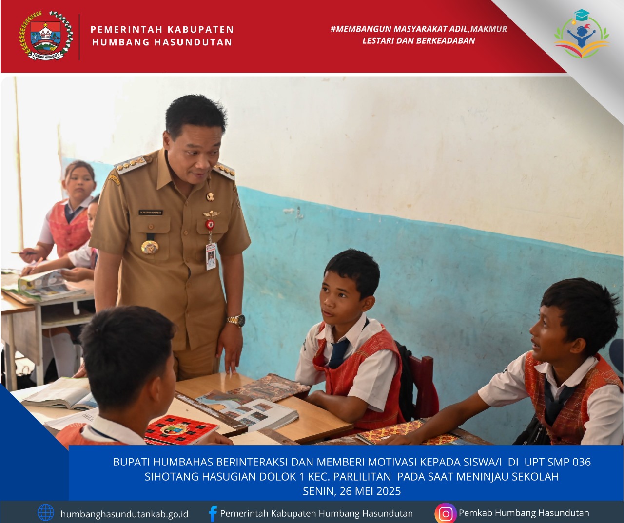 Bupati Humbahas Dr Oloan P Nababan SH MH Kunker (Kunjungan Kerja) ke UPT SMPN 036 Sihotang Hasugian Dolok I Kecamatan Parlilitan, Senin 26 Mei 2025. Kunjungan seperti ini selalu dilakukan Bupati Humbahas guna mengetahui kondisi situasi di setiap sekolah.